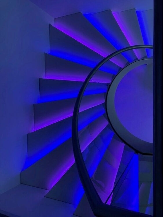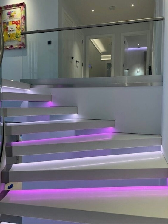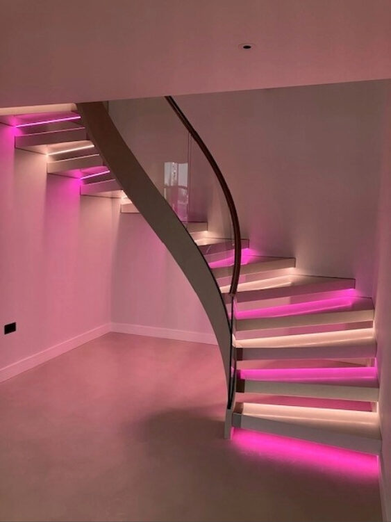 The design focuses on the juxtaposition of heavy natural materials with the transparency of modern glass and is highlighted by feature lighting. Concealed linear LED fittings are tucked beneath each tread or within the stringer gap, creating a back-lit glow that creates atmosphere and makes the stone steps appear to “float”.