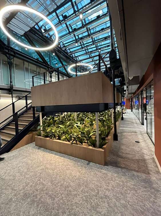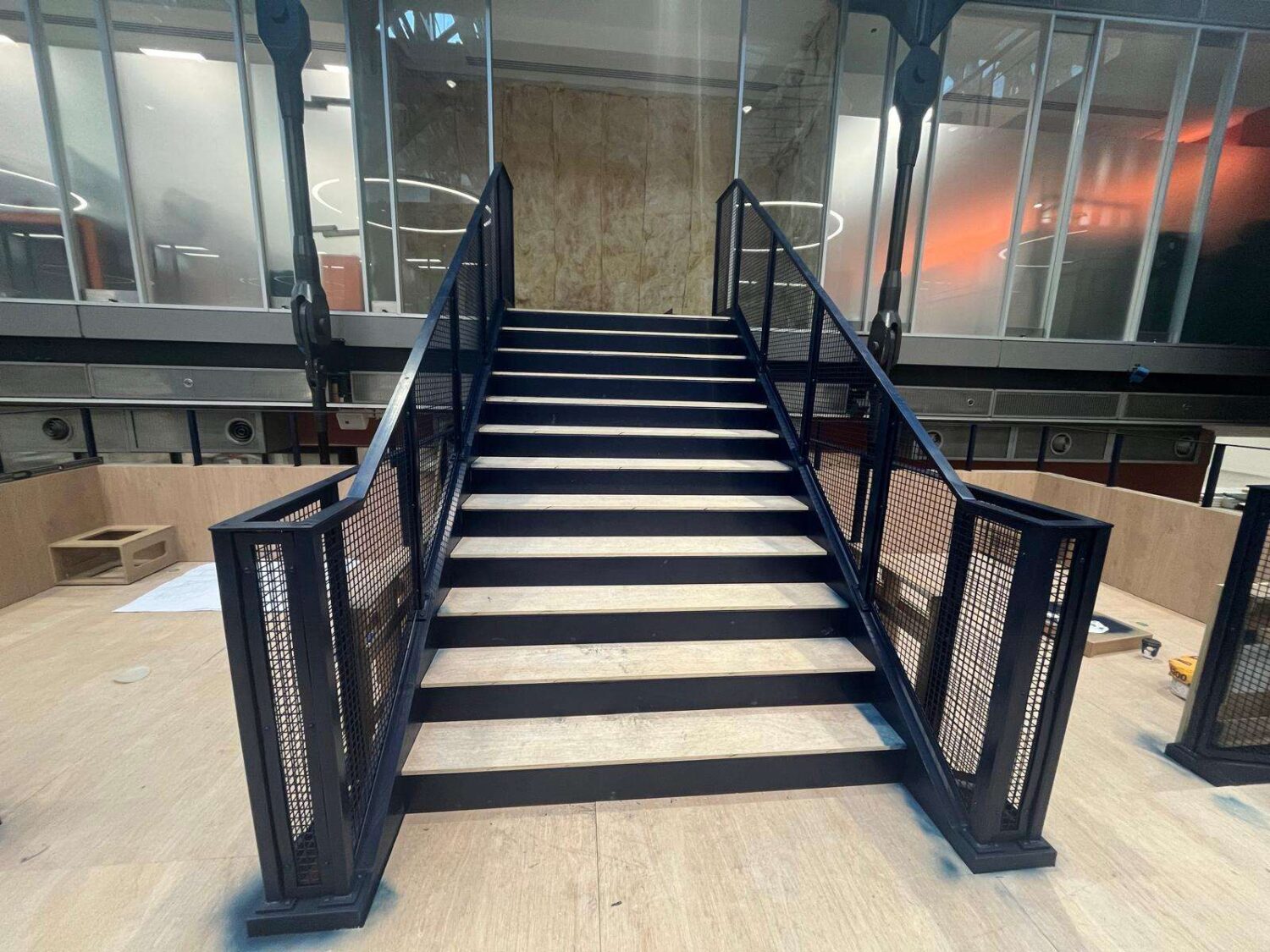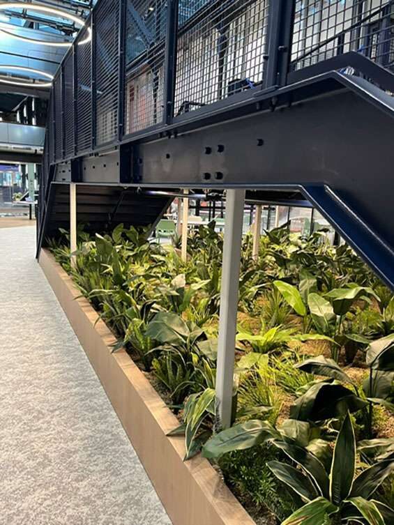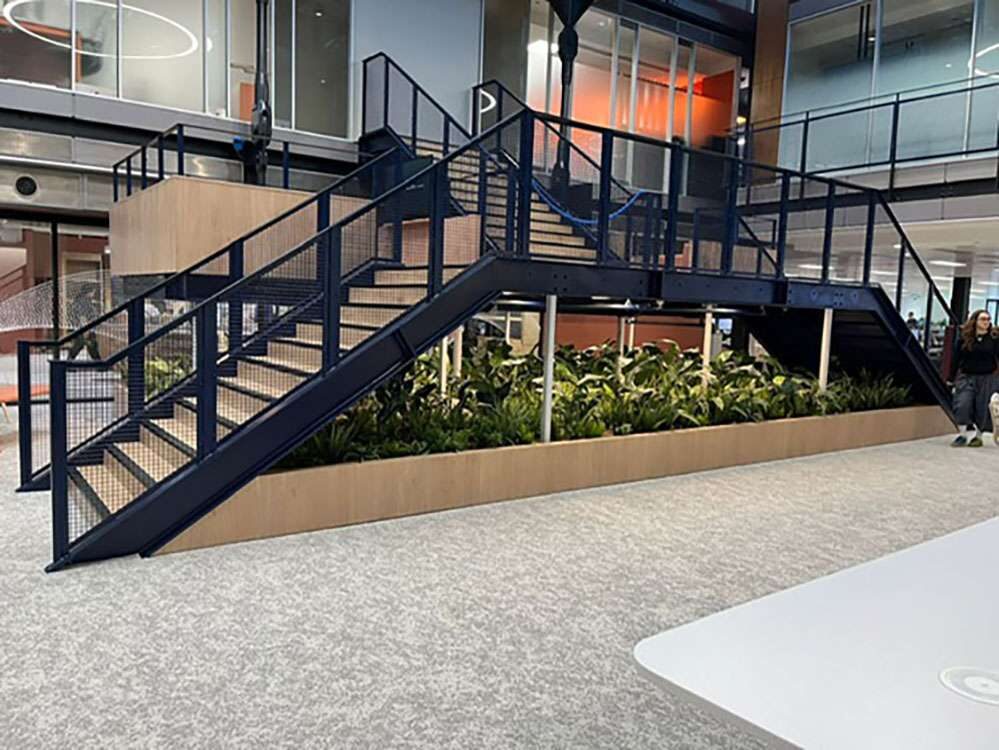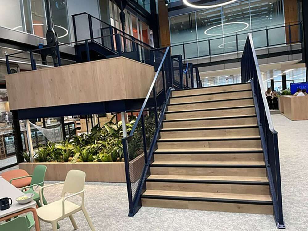 The balustrading reinforces the project’s engineered robust, functional character. Vertical square hollow section (SHS) uprights are precision-mounted to the top edge of the stringers, supporting side-mounted weld mesh panels that provide security while optimising light and airflow. This mesh detail is carried through to the upper floor edges and the low-level timber surrounds on the platform landings, ensuring a cohesive wrap-around effect. The result is a high-impact circulation core where the deliberate pairing of heavy-duty steelwork and perforated textures creates a striking, transparent focal point.
