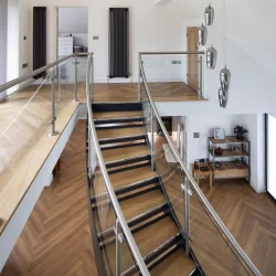 Handrail supported by 42 diameter uprights to every third tread with toughened glass infill panels and satin polished stainless steel metalwork
