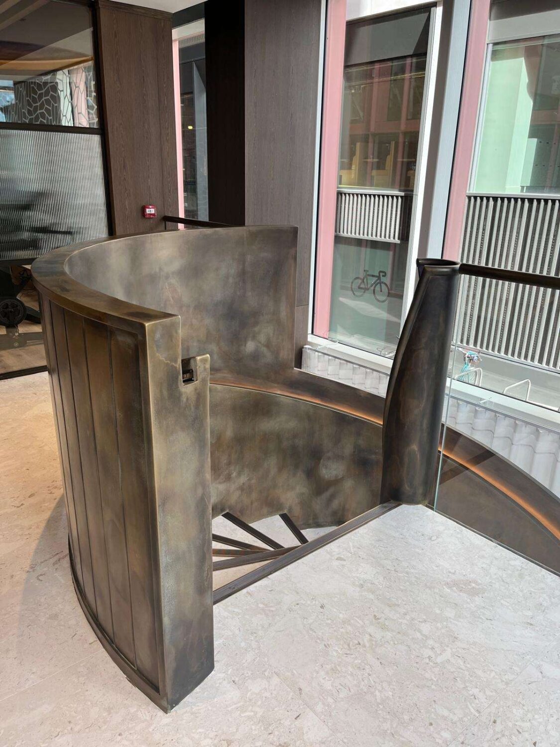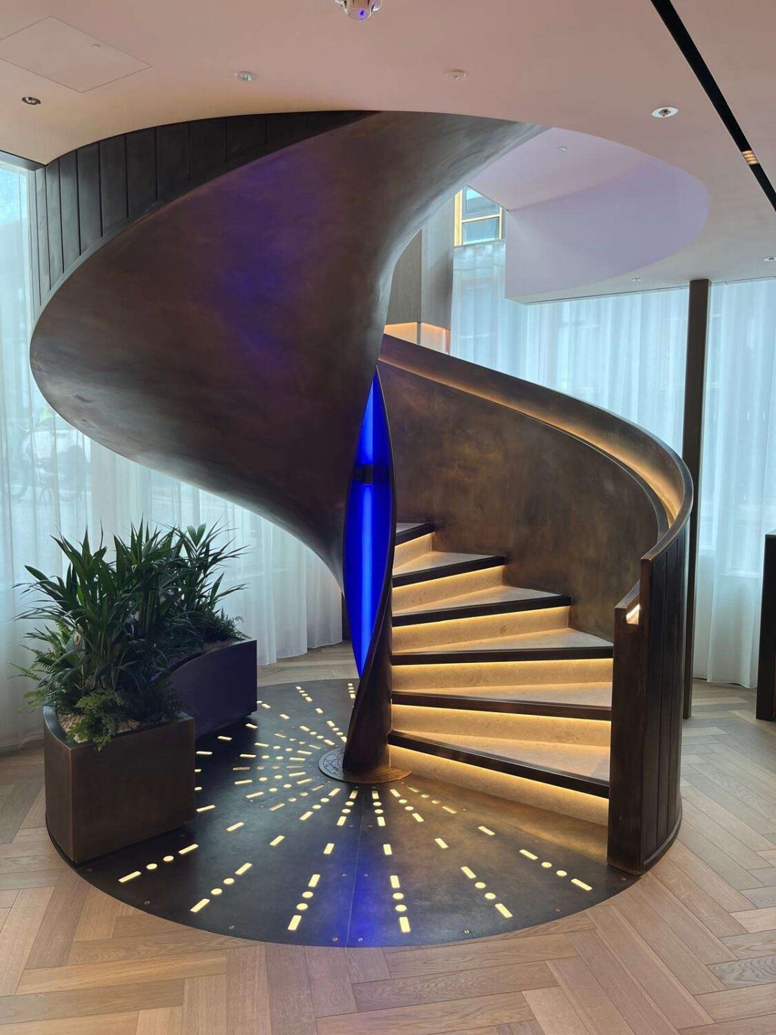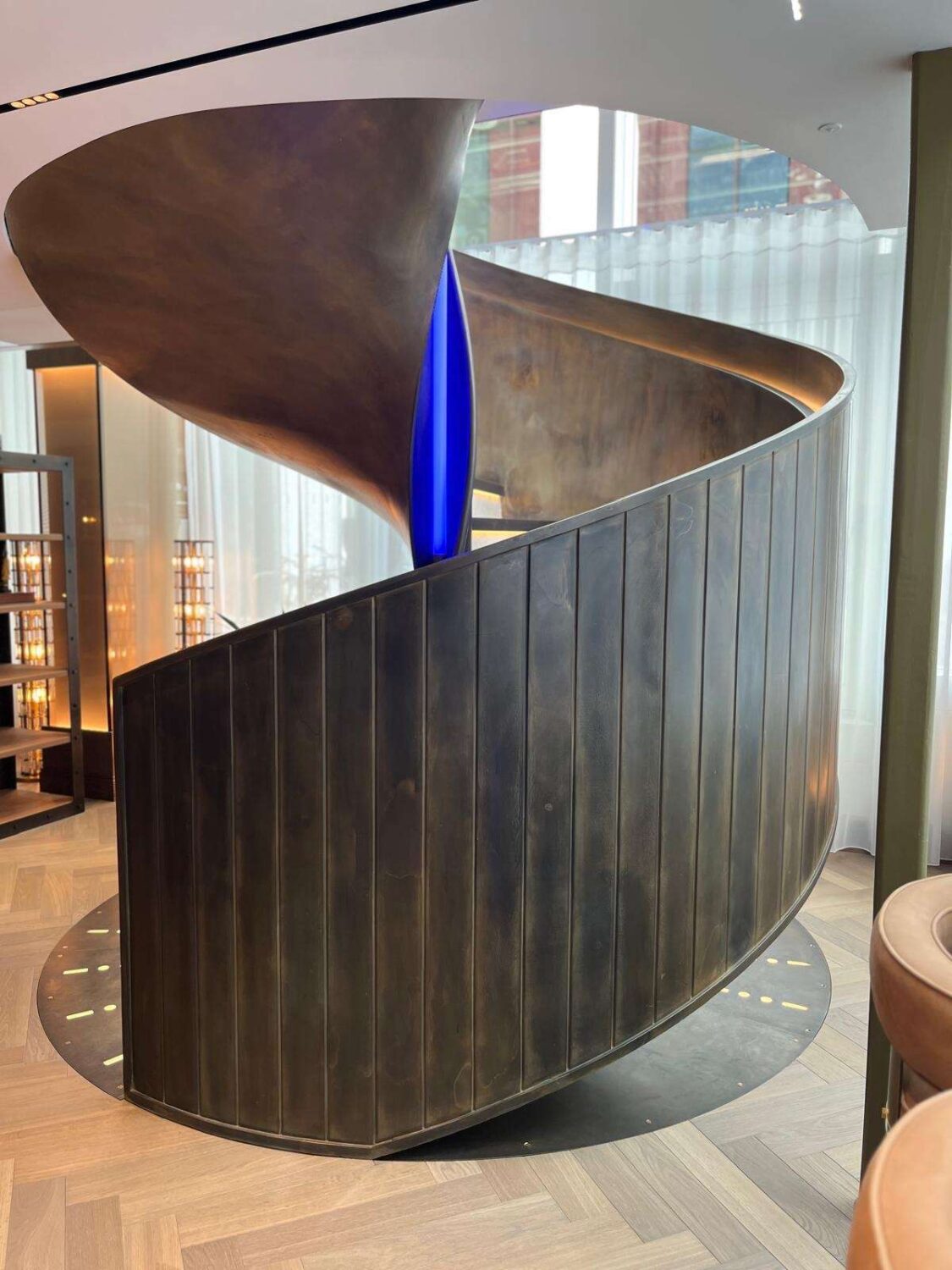 A helical statement in steel, timber and bronze with soft LED lighting.