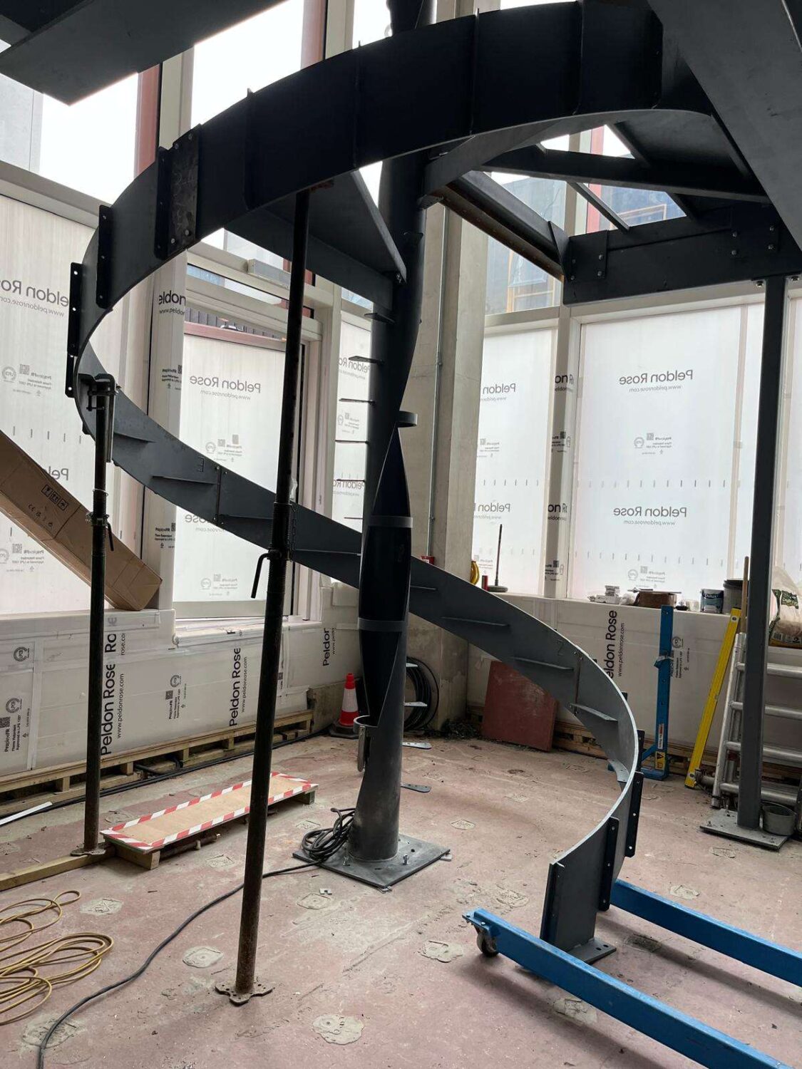 The structure is built around a precision-engineered mild steel frame, featuring folded plate treads and a distinct inner column stringer. To achieve a seamless look, the exterior is wrapped in custom-patterned formwork with GRG (Glass Reinforced Gypsum) cladding, which flows into a smooth, continuous soffit on the underside.